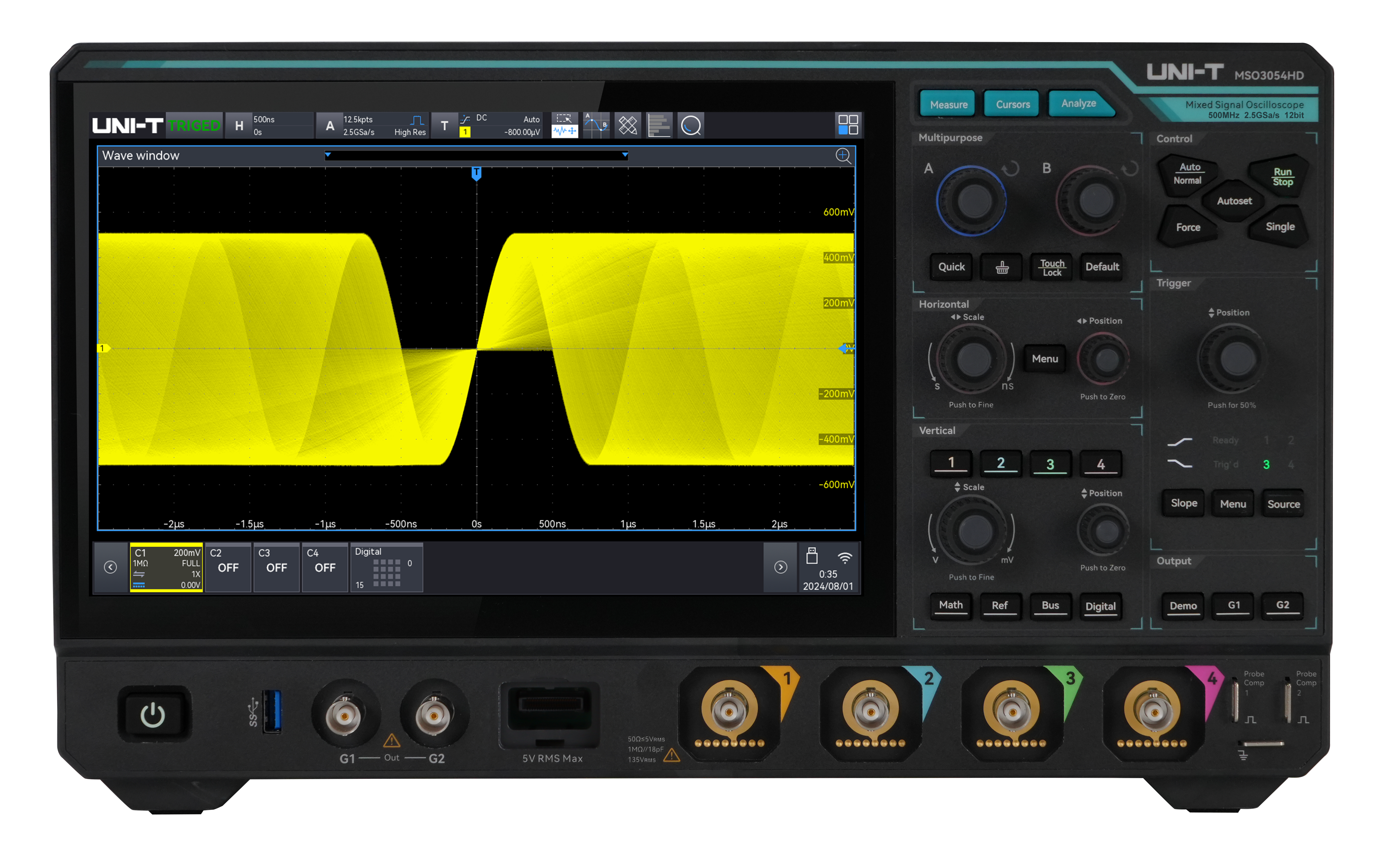 The MSO3054HD is a high-performance R12™ 12-bit resolution mixed-signal oscilloscope with a 500 MHz bandwidth and 4 analog channels, ensuring precise signal analysis. With a 2.5 GSa/s sampling rate and 500Mpts memory, it delivers detailed waveform capture.
