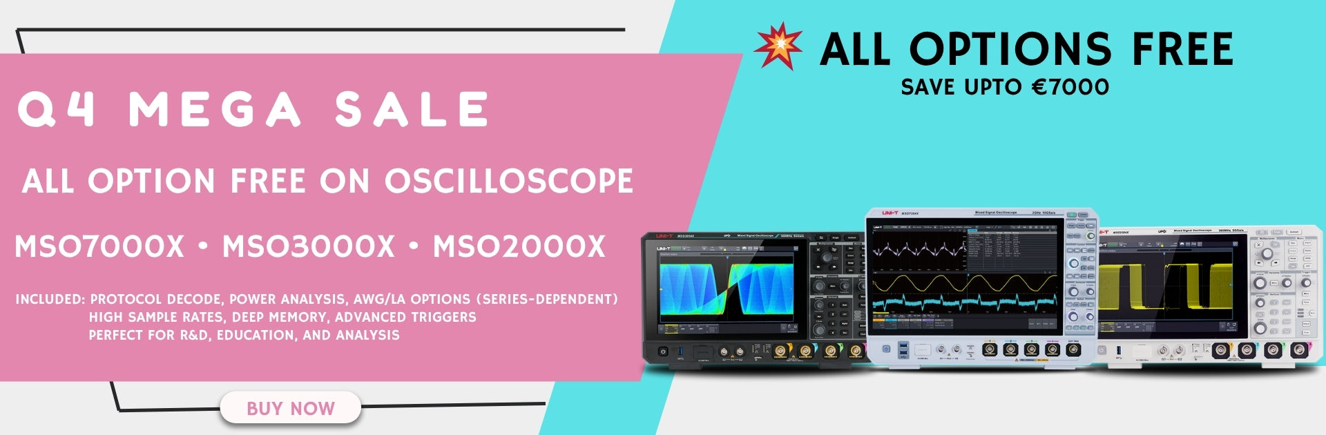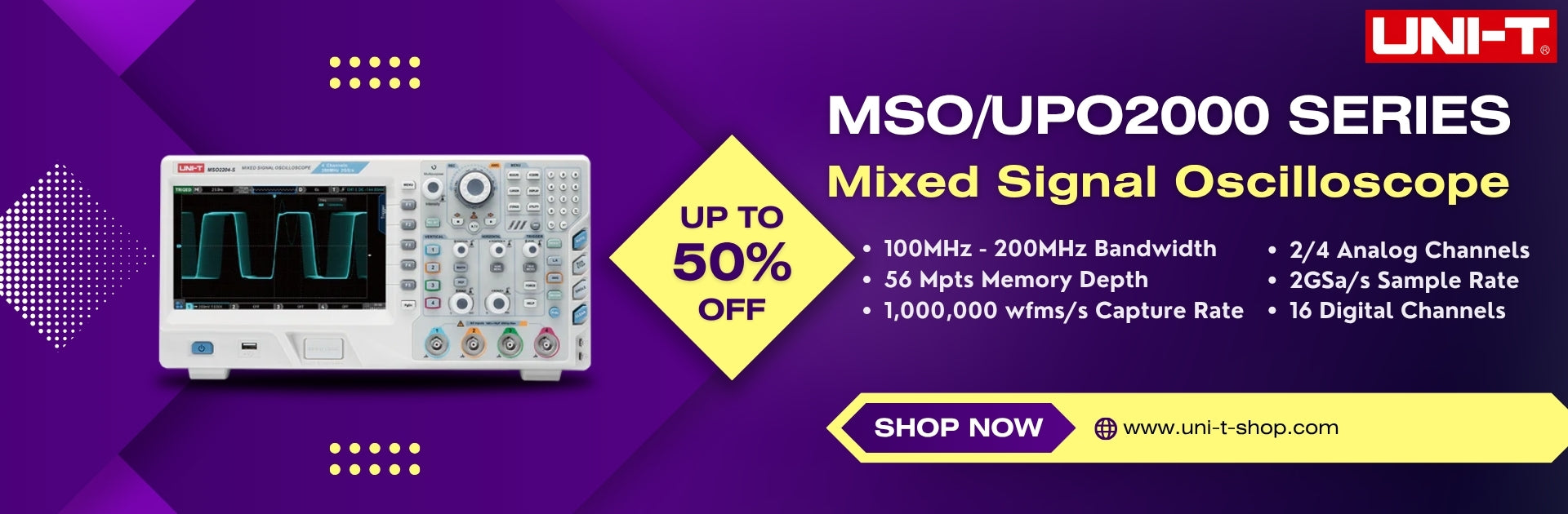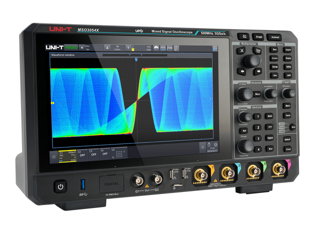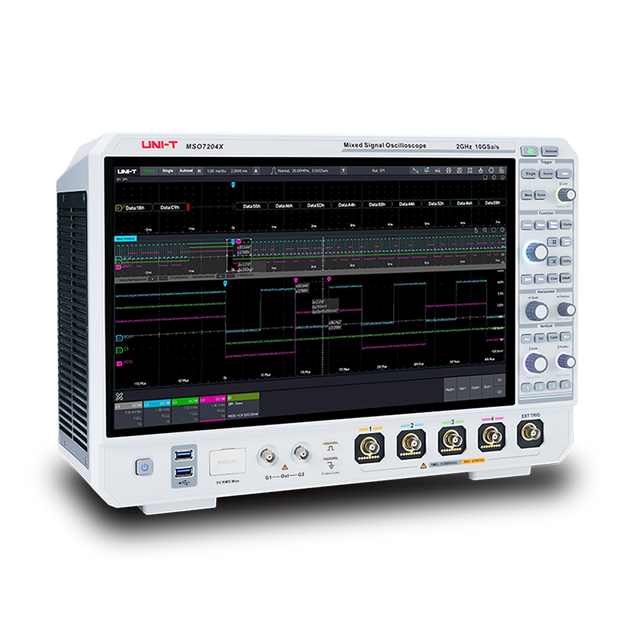 The UNI-T MSO7204X is a 2 GHz mixed-signal oscilloscope with 4 channels, offering 10 GSa/s sampling and a 15.6-inch HD touchscreen for smooth operation. It delivers precise signal analysis with advanced features like protocol decoding and power analysis.