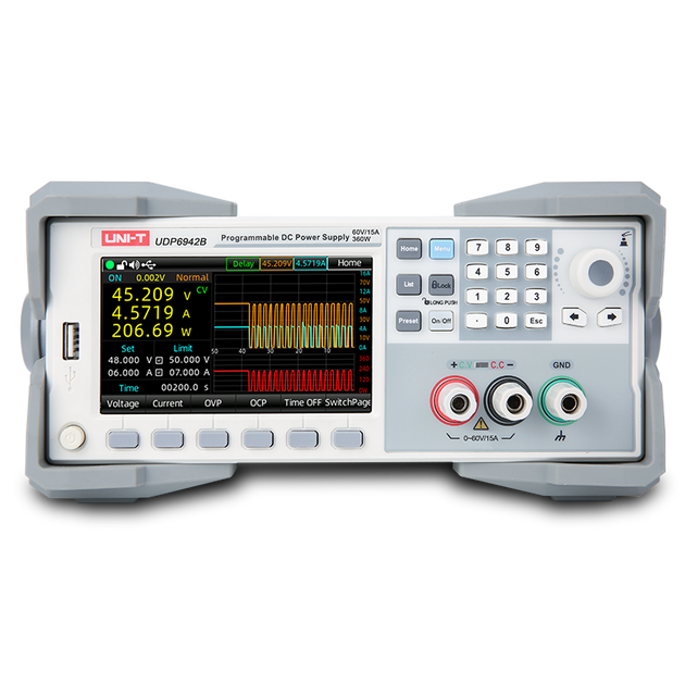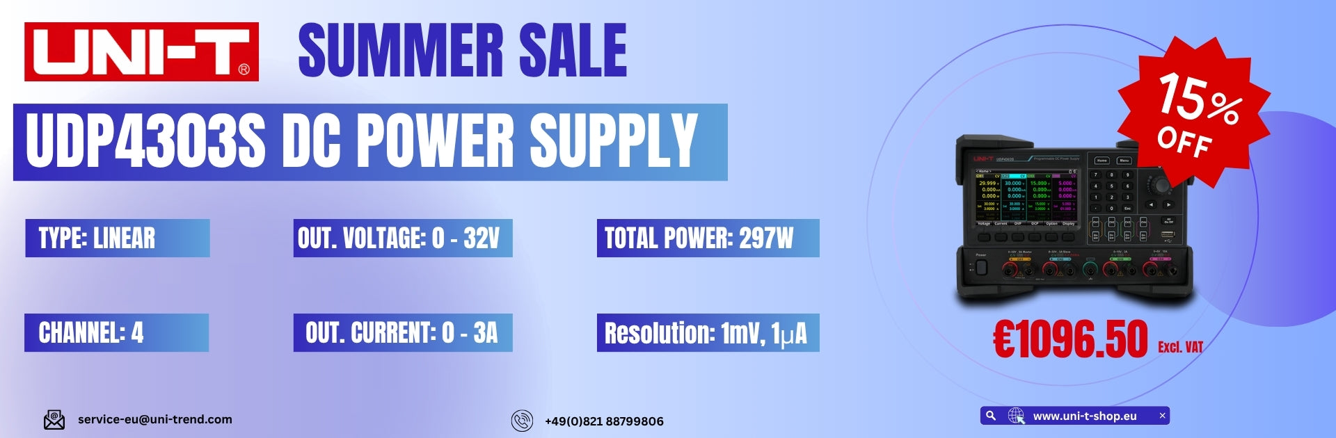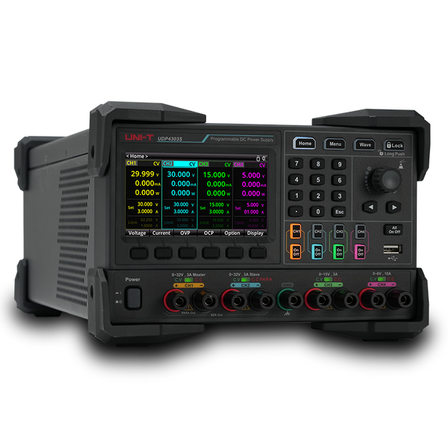The Uni-Trend UDP4303S Linear DC Power Supply offers 4 channels with 297W output, including CH1/CH2 (32V/3A), CH3 (15V/3A), and CH4 (6V/10A).