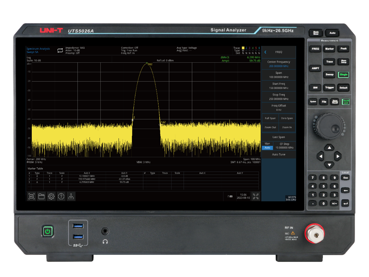 The Uni-Trend UTS3036T+ Performance-Series Spectrum Analyzer is an affordable 3.6GHz signal analyzer for EMI pre-compliance testing and a variety of other applications.