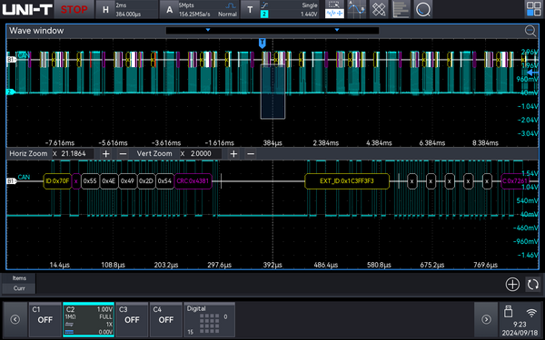 - Protocol trigger and decoding functions. Included: RS232/UART, I2C, SPI. Optional: CAN, CAN-FD, LIN, FlexRay, AUDIO, SENT