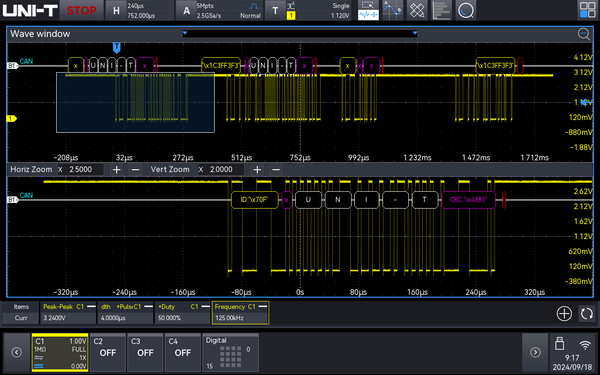 • Protocol Decoding: RS232/UART, I2C, SPI, CAN, CAN-FD, LIN, FlexRay, AUDIO, MIL-STD-1553B, ARINC429, and more