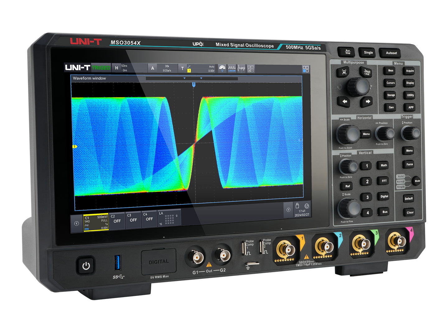 • Real-time sampling rate: Up to 5 GSa/s for analog channels, 1.25 GSa/s for digital channels